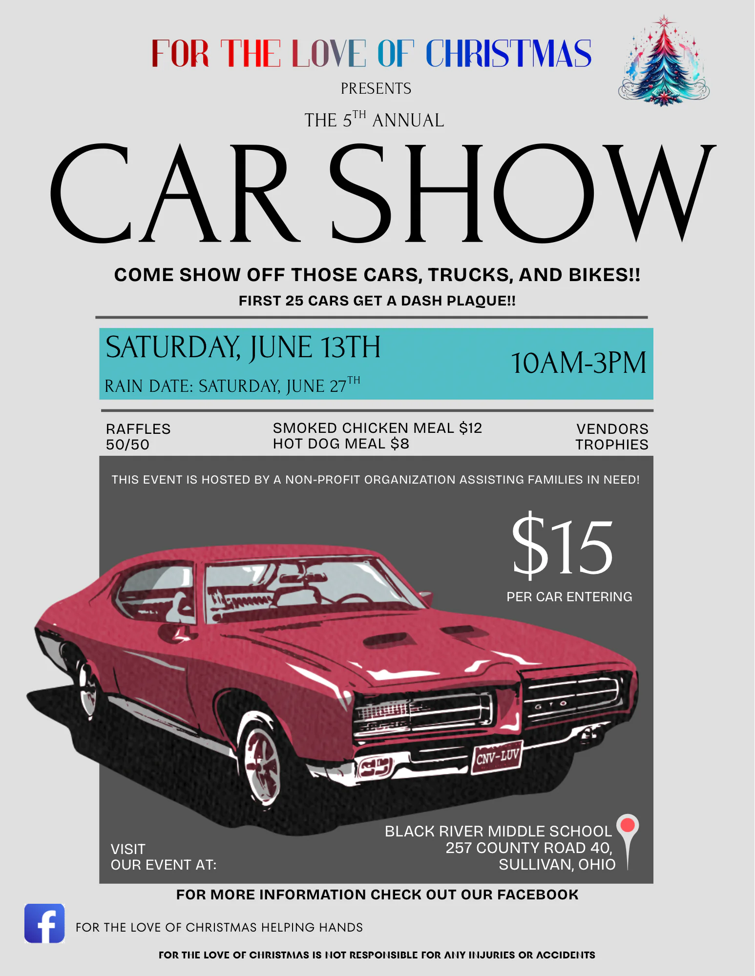Our Event was started in 2022. We are a non-profit organization helping Families in need during the holidays. This yearly car show helps raise money to make Christmas magical for many families who struggle to provide. We have Best of Show, Best of Car/Trucks and Bikes awards, 50/50 Raffles, games, and much more.