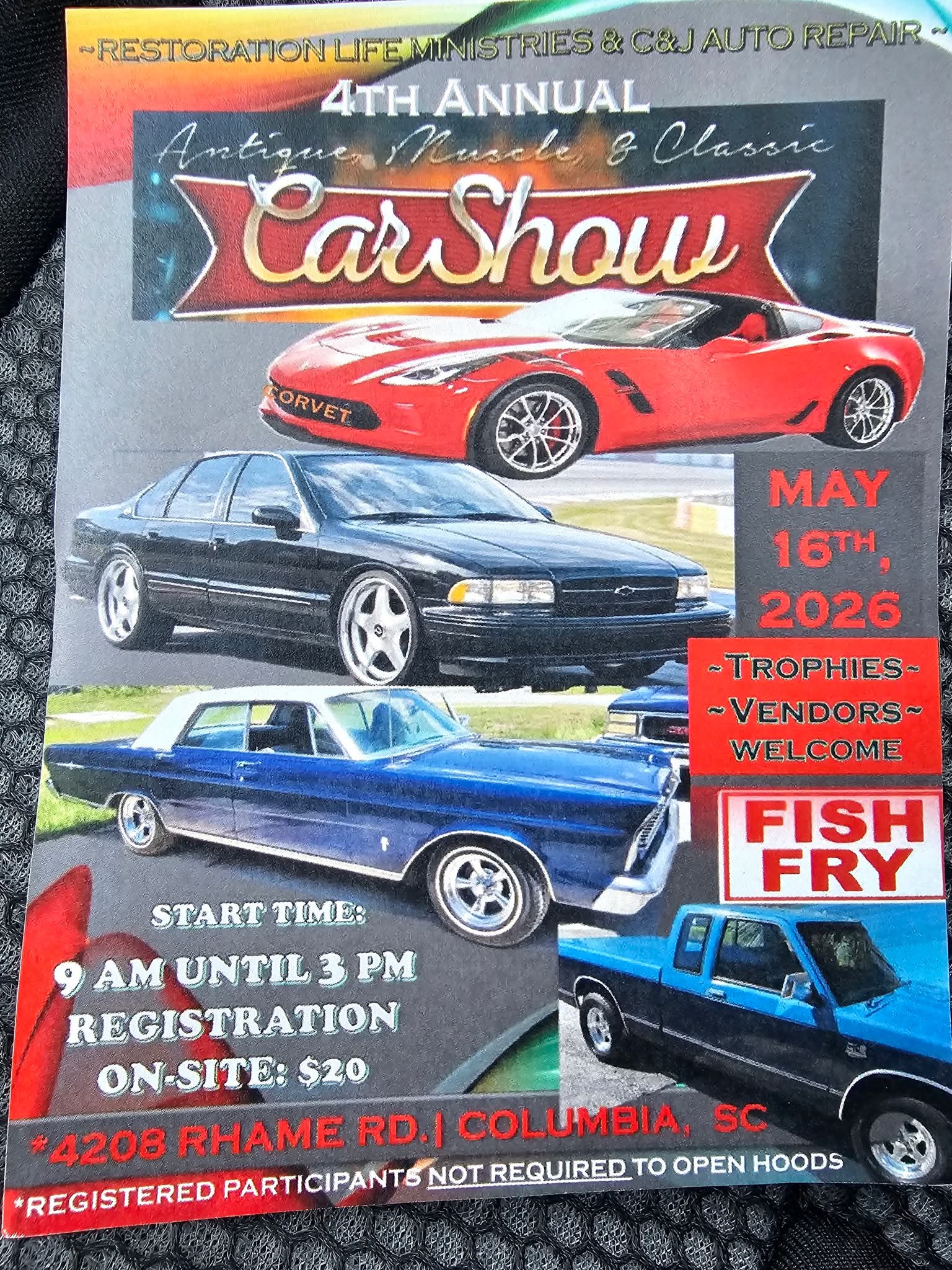 -RESTORATION LIFE MINISTRIES & C&J AUTO REPAIR 4TH ANNUAL Antique, Muscle, & Classic Car Show CORVET MAY 16TH 2026 -TROPHIES--VENDORS~...